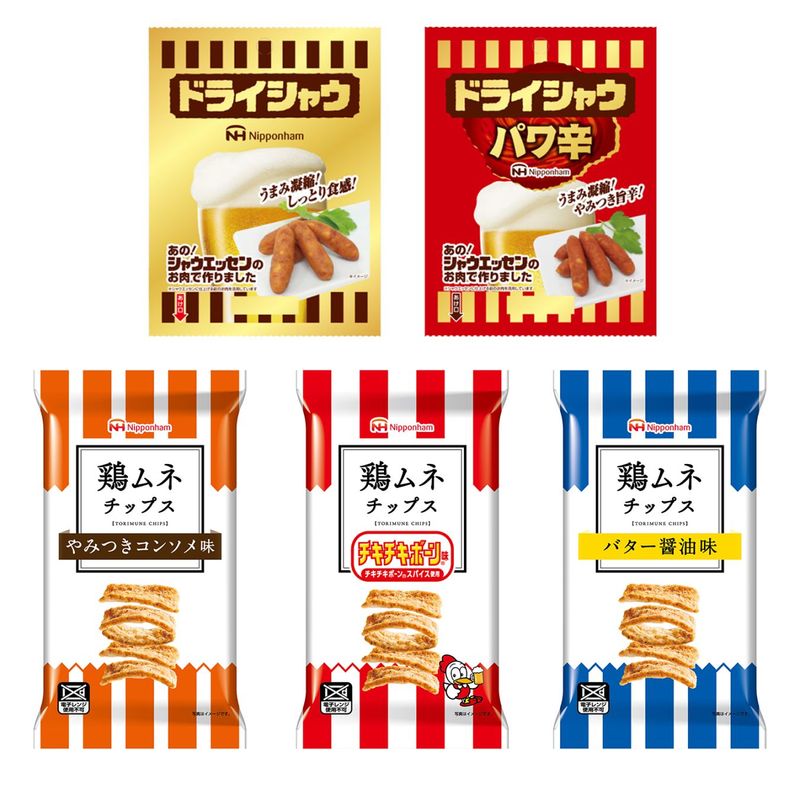 ・ドライシャウ37g ・ドライシャウパワ辛35g ・鶏ムネチップスチキチキボーン味27g ・鶏ムネチップスやみつきコンソメ味27g ・鶏ムネチップスバター醤油味27g |