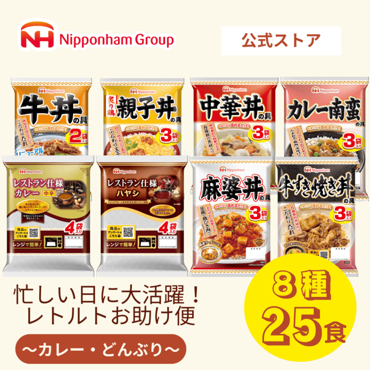 | セット内容 | ・レストラン仕様カレー 中辛(レンジ包材)680g ・レストラン仕様ハヤシ(レンジ包材)540g ・どんぶり繁盛 中華丼の具414g ・どんぶり繁盛 炙り鶏親子丼の具480g ・どんぶり繁盛 麻婆丼の具420g ・どんぶり繁盛 牛すき焼き丼の具285g ・どんぶり繁盛 牛丼の具240g ・どんぶり繁盛 カレー南蛮の具330g |