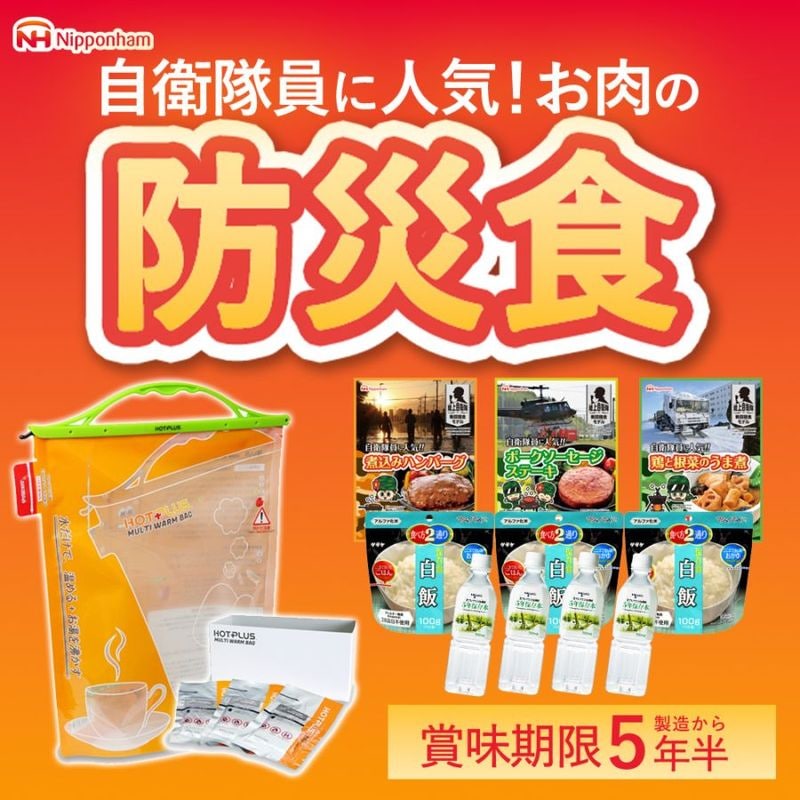 | セット内容 | ・ポークソーセージステーキ110g×1パック ・鶏と根菜のうま煮100g×1パック ・煮込みハンバーグ115g×1パック ・北アルプス立山連峰5年保存水500ml×4本 ・マジックライス 保存食 白飯100g×3パック ・マルチウォームバッグ×1袋 |